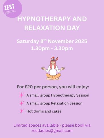 For just £20 per person you'll take part in a group Hypnotherapy session as well as a soothing group Relaxation session. Hot drinks and cake will complete your